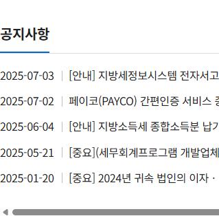 - 세금 신고 및 납부 절차 : 로그인 후, 원하는 세목을 선택하여 신고서를 작성하고, 납부 버튼을 클릭하면 납부를 진행할 수 있습니다. 이때 세금 정보 확인 후 결제 방법을 선택하면 됩니다.